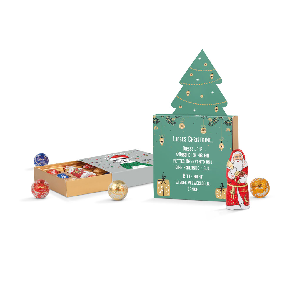 Lindt Präsent Werbeschuber aus weißem Karton Kleine Kostbarkeiten, Santa