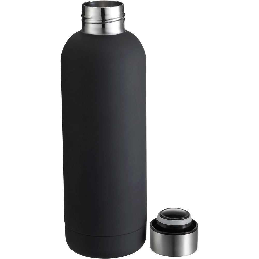 Wunderbargeradlinige und unaufdringlich elegante Edelstahl-Thermosflasche, die mit ihrer Strukturlack-Pulverbeschichtung hervorragend in der Hand liegt.