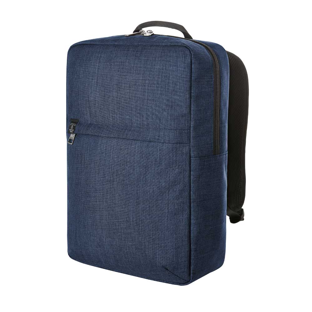 gradlinig gearbeiteter Rucksack; rPET Obermaterial; großes Hauptfach mit 2-Wege-Reißverschluss und gepolstertem Notebookfach; Reißverschluss-Vortasche; aufwändig gepolsterter Rücken mit verstecktem Reißverschlussfach; längenverstellbare gepolsterte Schultergurte mit Gummischlaufen zum Befestigen von z.B. Sonnenbrille; Handgriff