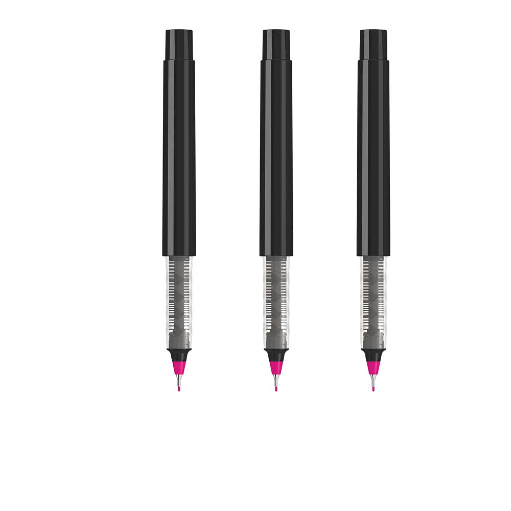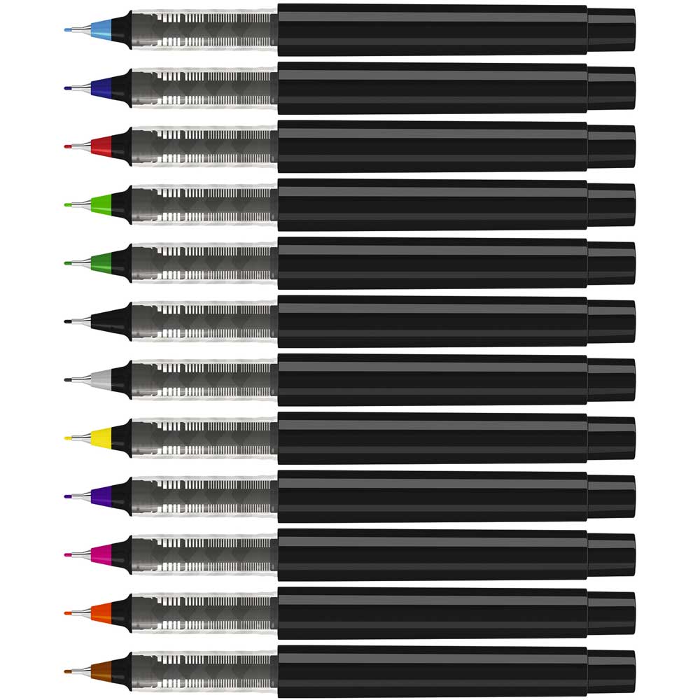 Fineliner mit Gehäuse aus recyceltem PET-Material in gedeckt glänzend weiß oder schwarz. Stopfen in den 12 möglichen Schreibfarben.