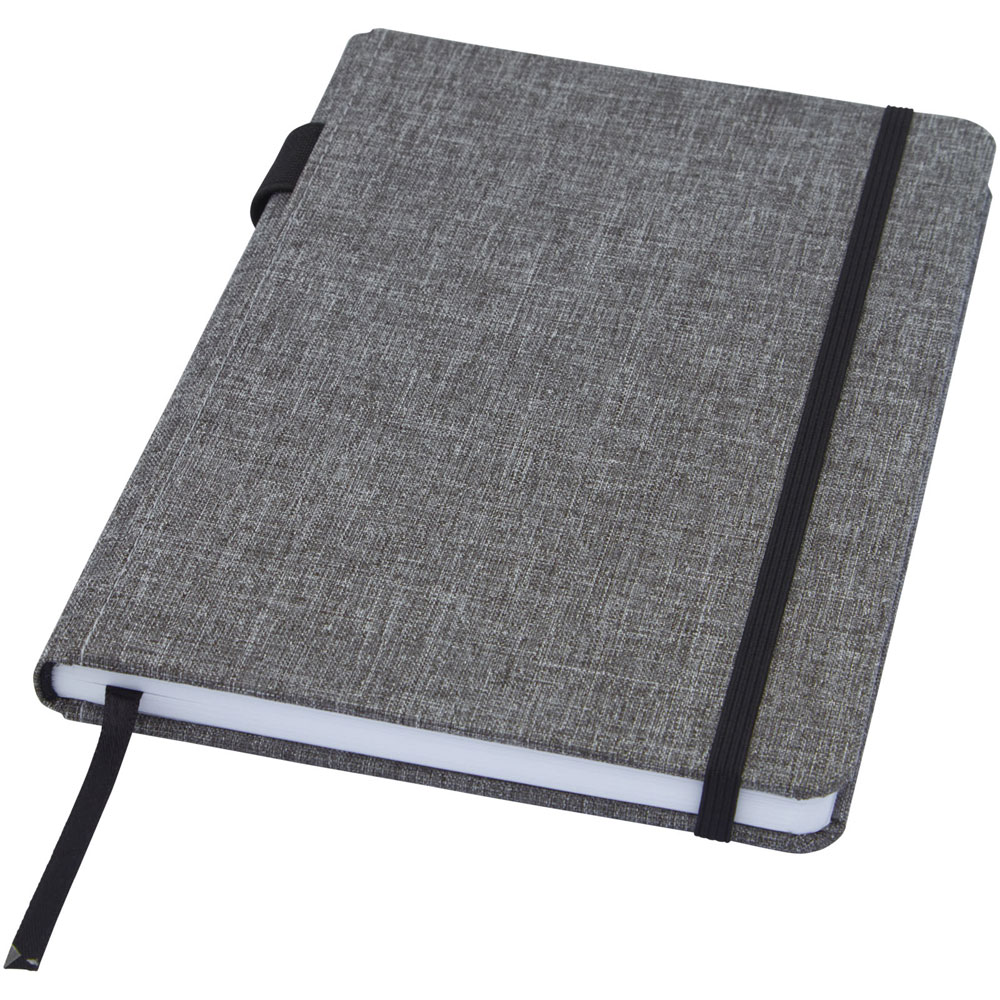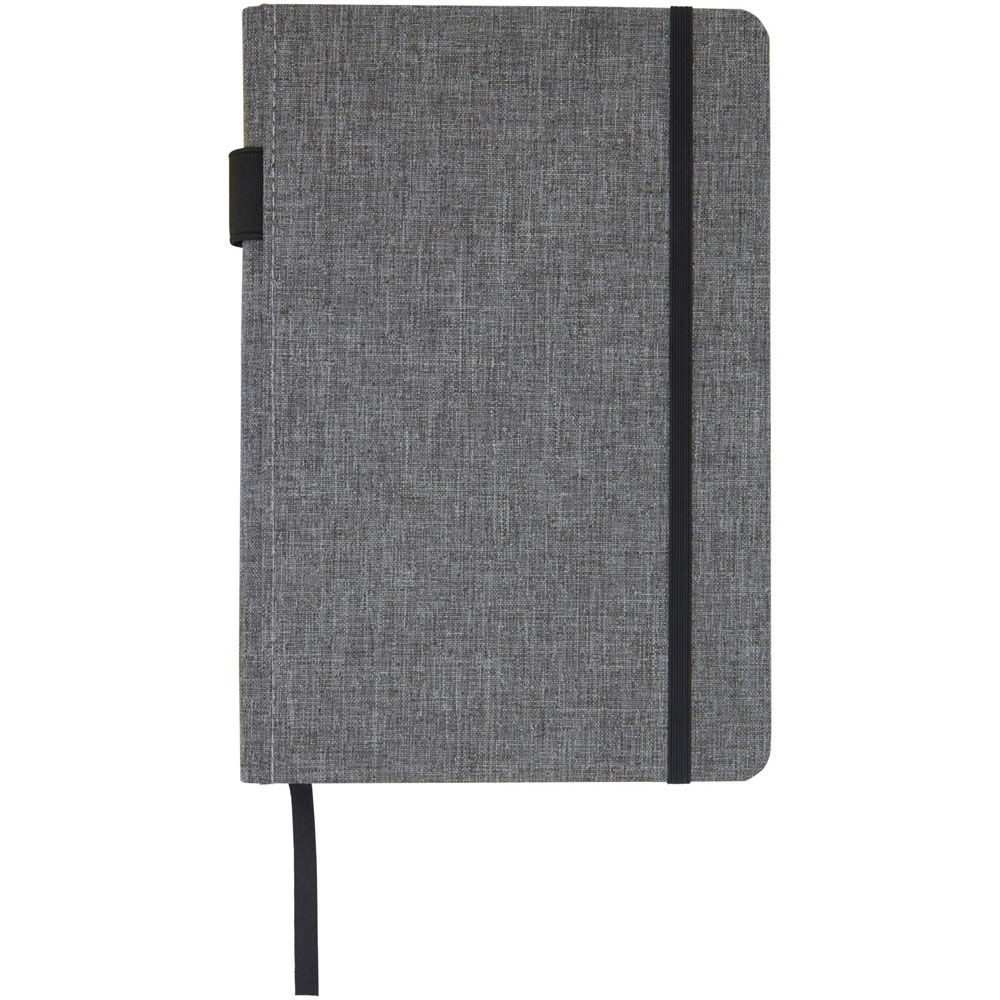 A5 Notizbuch mit einem Cover aus RPET-Stoff. Mit 96 Blatt, 70 g/m² recyceltes Papier mit liniertem Layout, Stiftschlaufe und Leseband. Verpackt in einer Kartonhülle.