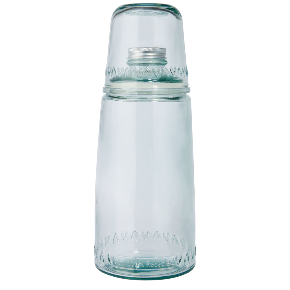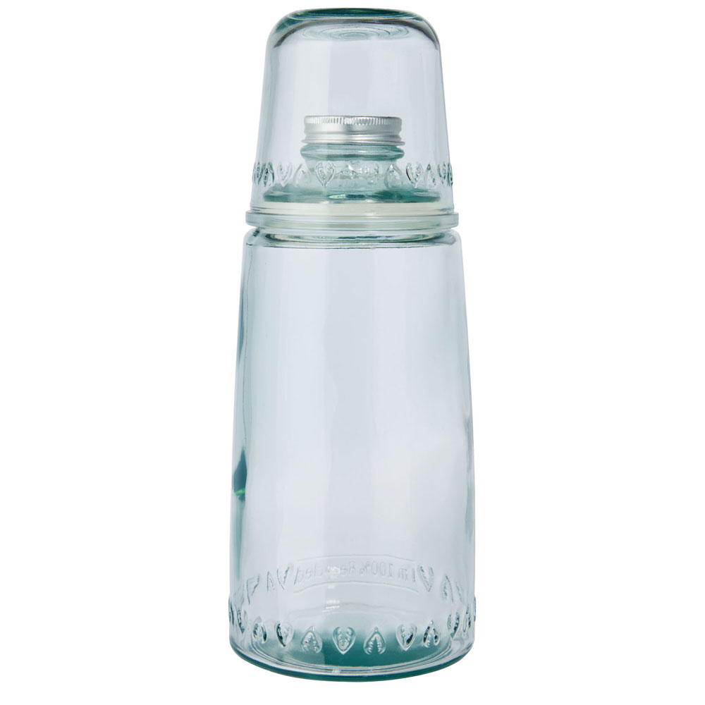 2-teiliges Set aus recyceltem Glas mit einer 1000ml Karaffe mit Aluminiumdeckel und einem 220ml Becher. Hergestellt aus 1 Glasflasche. Recyceltes Glas wird mit weniger Energie, Rohstoffen und Additiven hergestellt als für die Herstellung von herkömmlichem Glas erforderlich. Größe der Karaffe: Höhe 26 cm, Durchmesser 10 cm. Größe der Becher: Höhe 8,5 cm, Durchmesser 8,5 cm.
