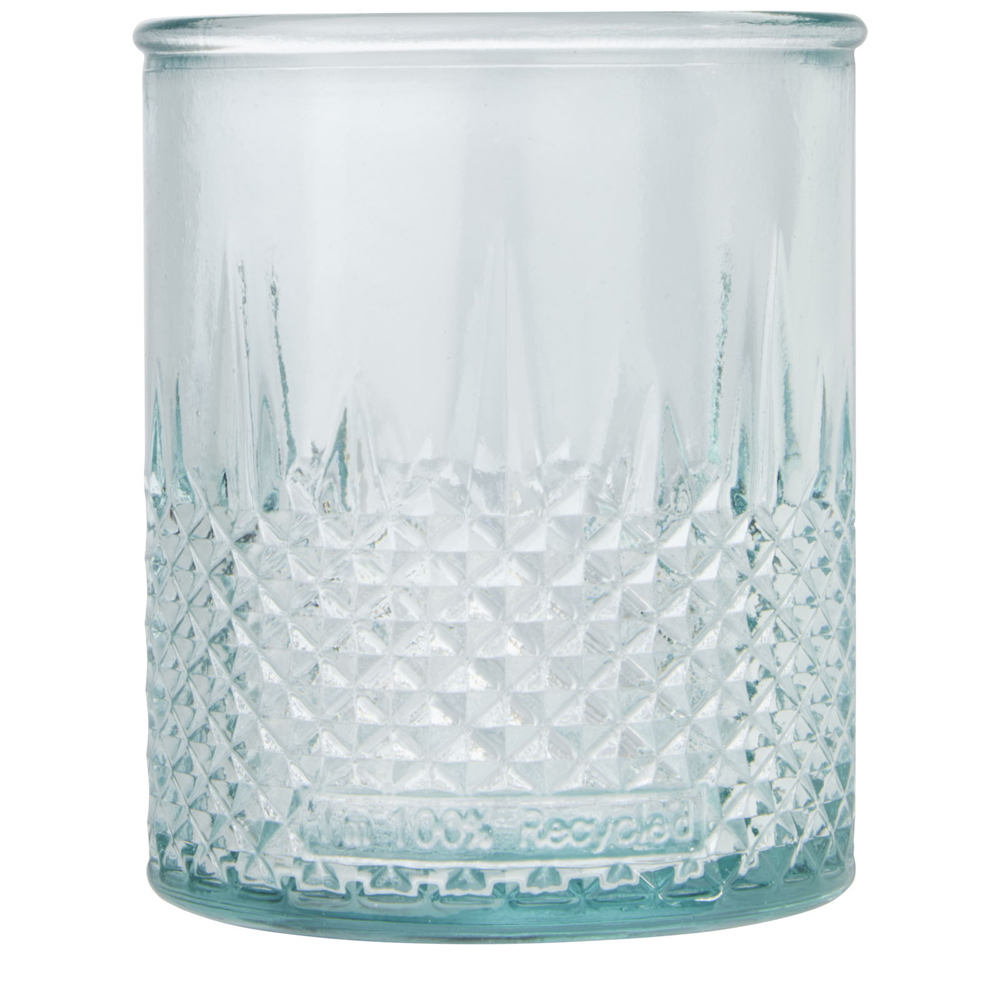 Teelichthalter aus recyceltem Glas mit Diamanteffekt. Hergestellt aus 1 Glasflasche. Recyceltes Glas wird mit weniger Energie, Rohstoffen und Additiven hergestellt als für die Herstellung von herkömmlichem Glas erforderlich. Teelicht nicht enthalten.