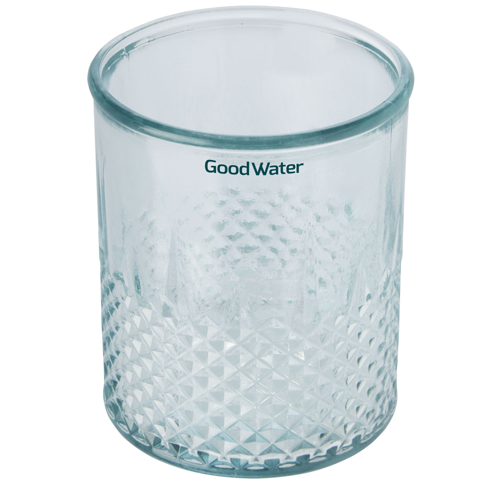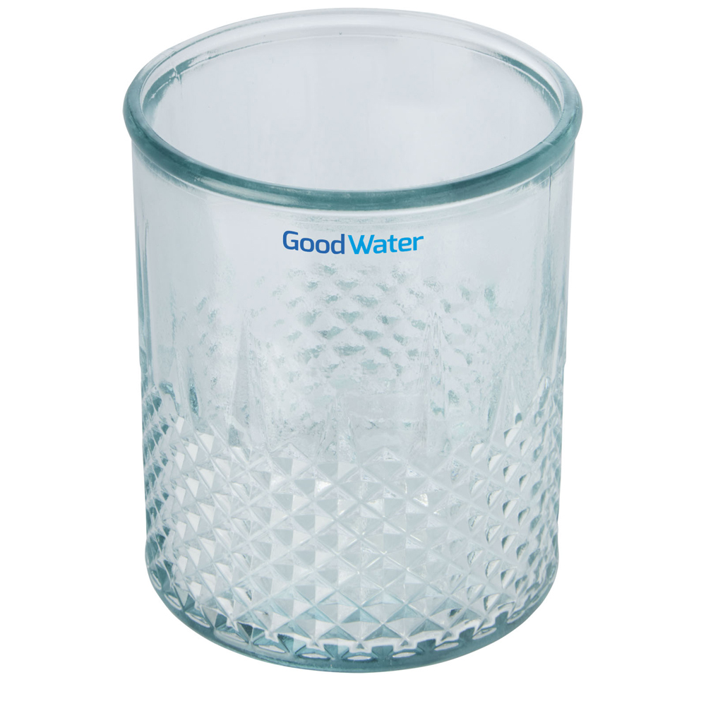 Material: Recyceltes Glas Maße: 10,5 x Ø 8,7 cm Werbefläche: 25 x 10 mm Gewicht: 0,375 Kg Veredelungsmöglichkeit: Tampondruck, Lasergravur