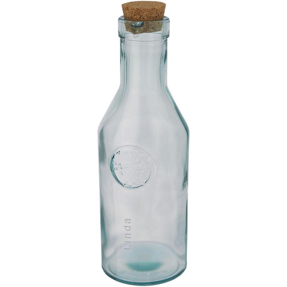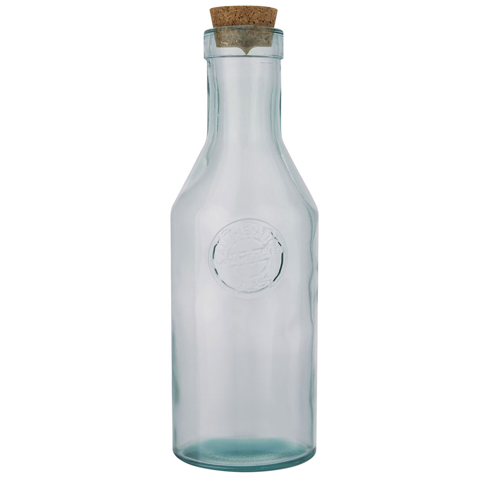 1000-ml-Glaskaraffe mit Korkdeckel aus 100 % recyceltem Glas mit exklusivem Design. Diese nachhaltige und trendige Karaffe ist perfekt zum Servieren von Wasser, Säften, Öl oder Essig. Die Karaffe ist aus recycelten Glasflaschen hergestellt. Recyceltes Glas wird mit weniger Energie, Rohstoffen und Additiven hergestellt als für die Herstellung von herkömmlichem Glas erforderlich. Die Karaffe ist spülmaschinenfest.