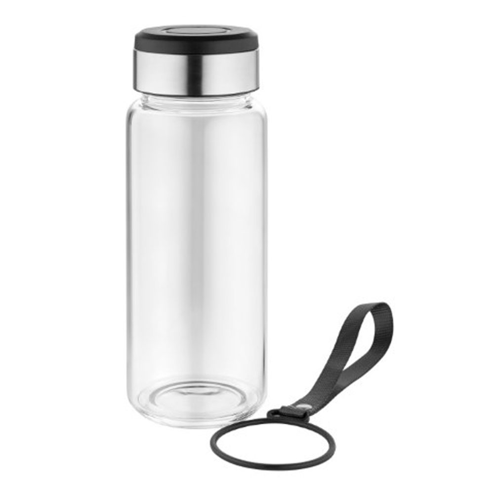 Nachfüllen statt Plastikmüll: Glastrinkflasche mit Thermotextil für Heiß- und Kaltgetränke, perfekt für die Generation Refill. LFGB-konform, Thermobeständiges Borosilikatglas, Edelstahldeckel, 750ml, VPE 40. Teesieb (herausnehmbar), Thermo-Manschette (abnehmbar), Designkarton