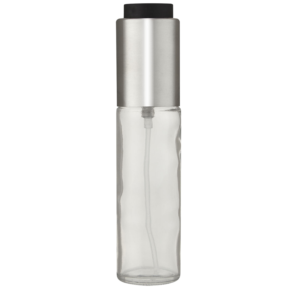 Ölsprühbehälter zum Kochen oder Backen aus Edelstahl und Glas. Er hat einen großen Druckknopf, mit dem sich die Dosierung leicht steuern lässt.