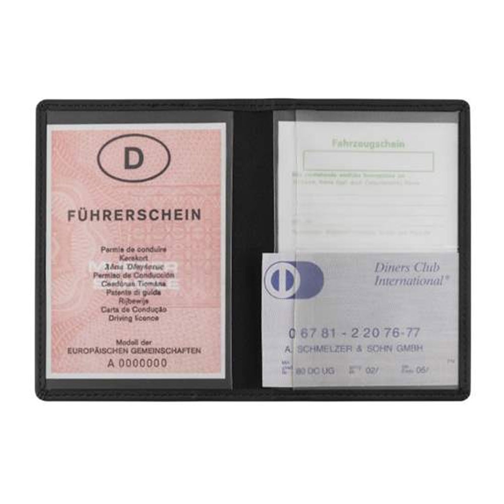 Hochwertige vegane Kunstlederführerscheintasche mit Soft Touch Haptik, kontrastierender Ziernaht und exzellenter Prägefähigkeit. Ausst: 4 transparente Fächer für Papiere, E Mobilitykarte, etc.