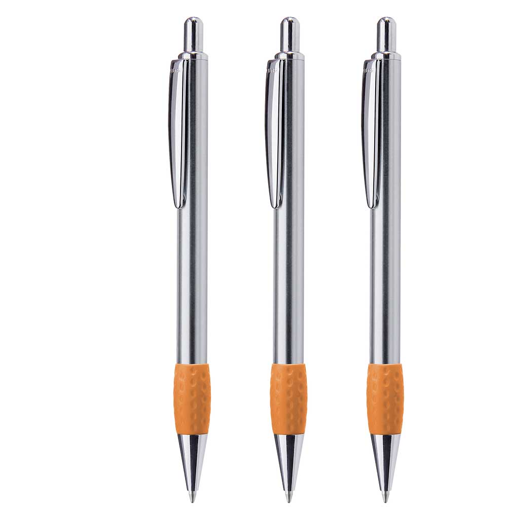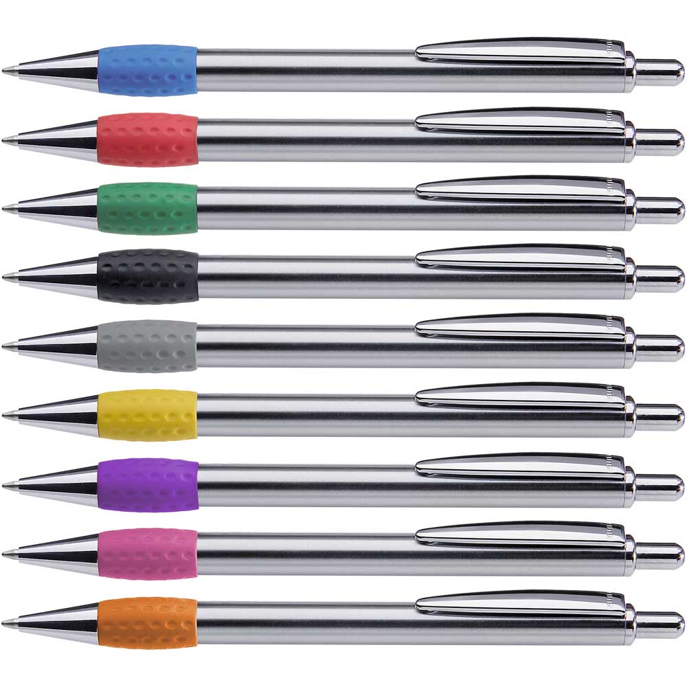 Metall-Druckkugelschreiber mit glanz verchromtem, lackiertem Schaft, Drücker, Clip und Spitze. Gummigriffzone farbig.