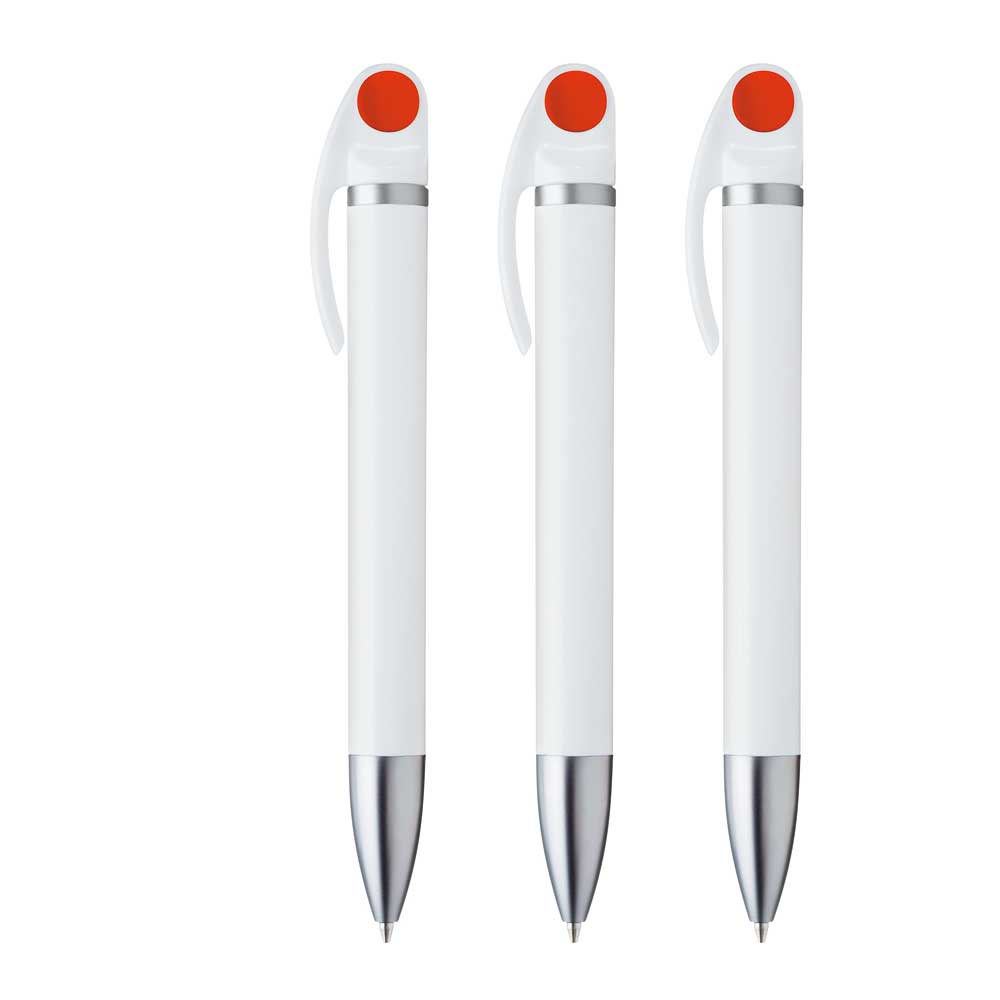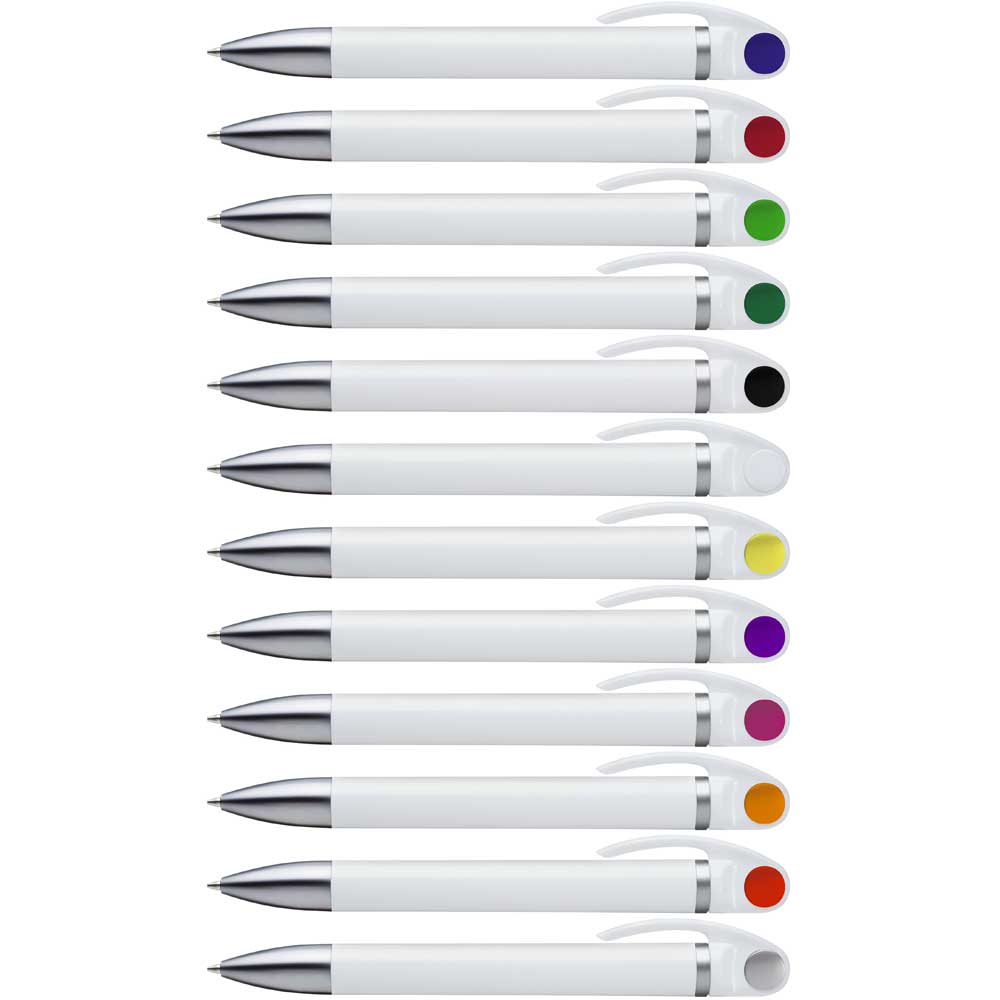 Drehkugelschreiber mit weißem oder schwarzen Gehäuse, silber mattem Zierring, farbigem Stopfen und schwere Mettspitze matt verchromt.