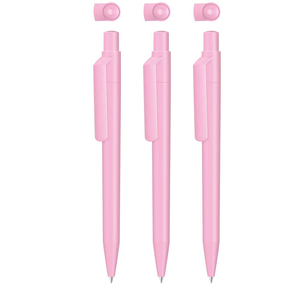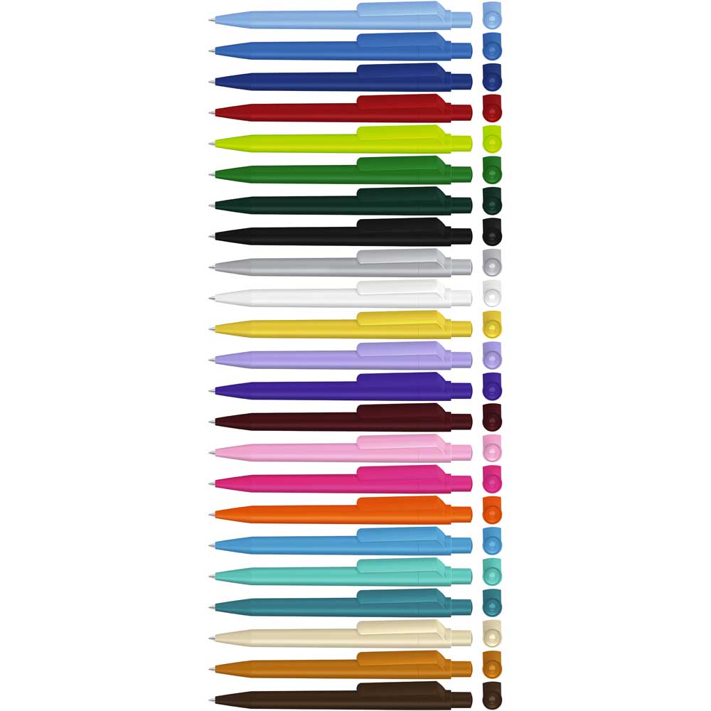 Druckkugelschreiber mit uni matt gedecktem Gehäuse, Clip, Drücker und Stopfen bzw. in uni weiß gedeckt mit farbigem Stopfen. Ab 2.000 Stück kann das Modell farblich kombiniert werden.