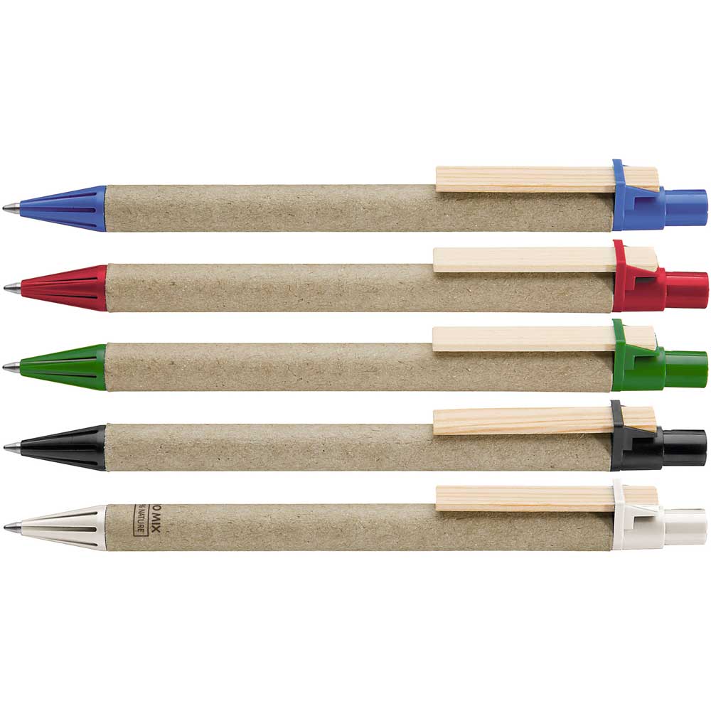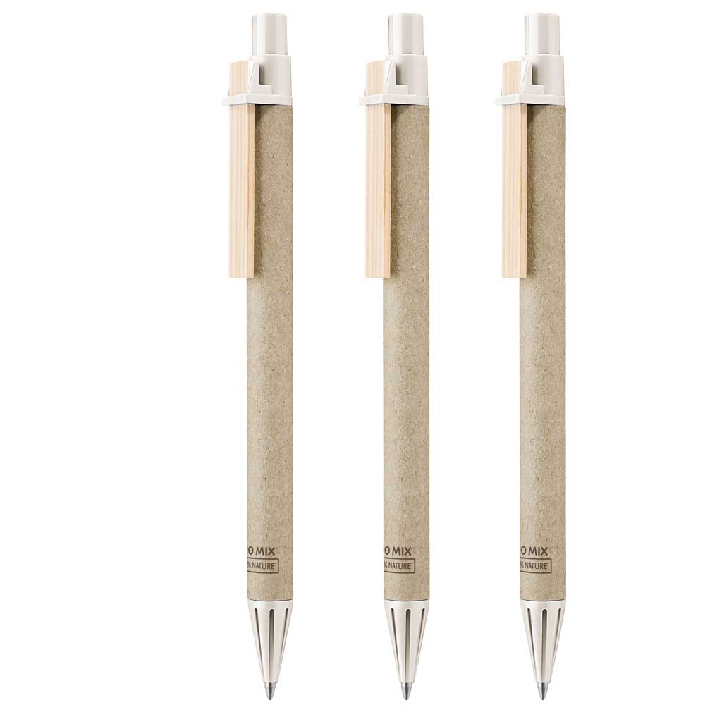 Druckkugelschreiber aus recycelter, naturfarbener Pappe. Spitze und Drücker unifarben aus recyceltem oder biologisch (Bio-Mix) abbaubarem Kunststoff sowie Holzclip.
