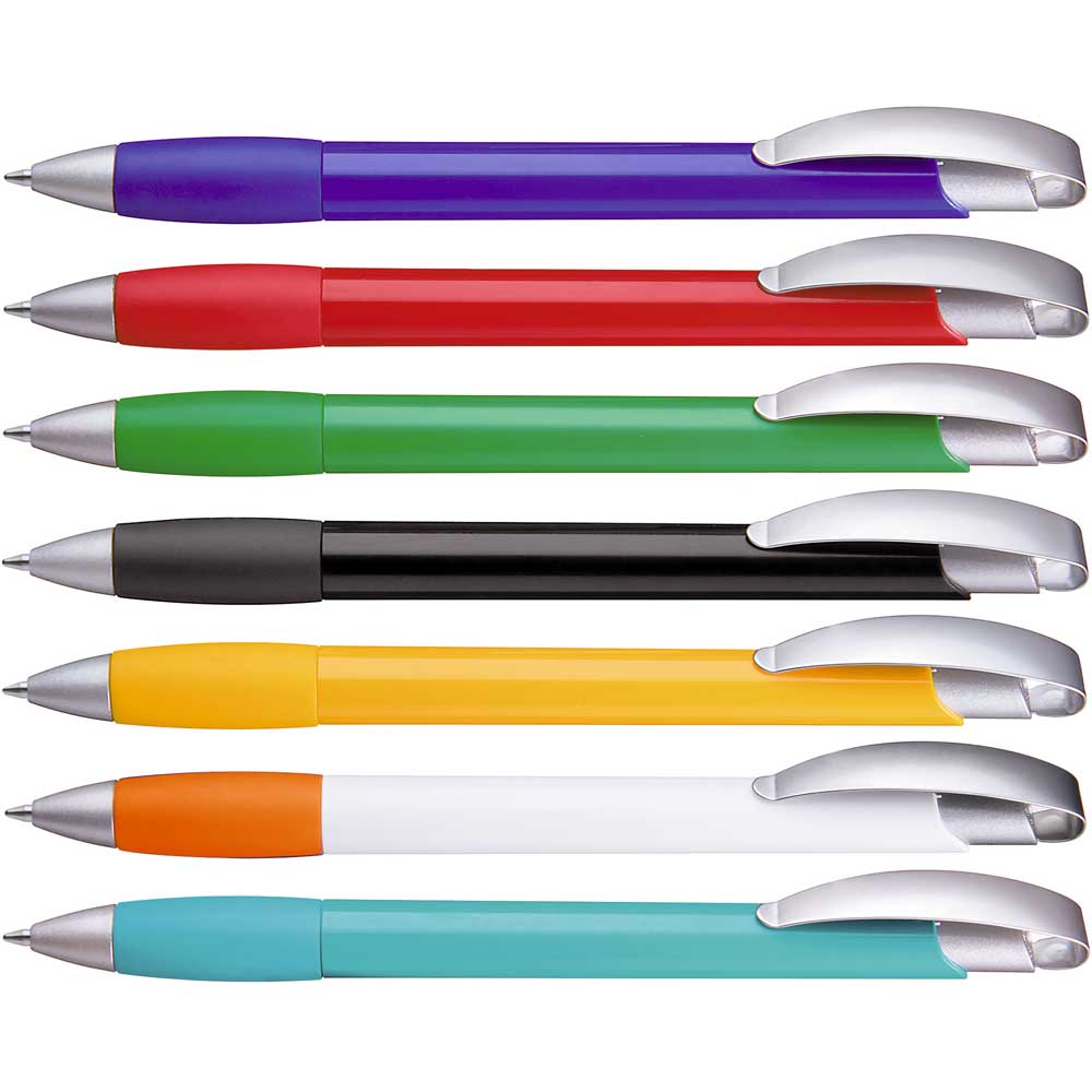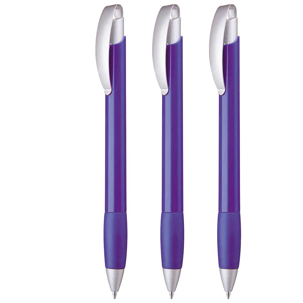 Druckkugelschreiber mit geschwungenem, matt verchromtem Metallbogenclipdrücker und gepolsterter Softgriffzone. Spitze matt silber.
