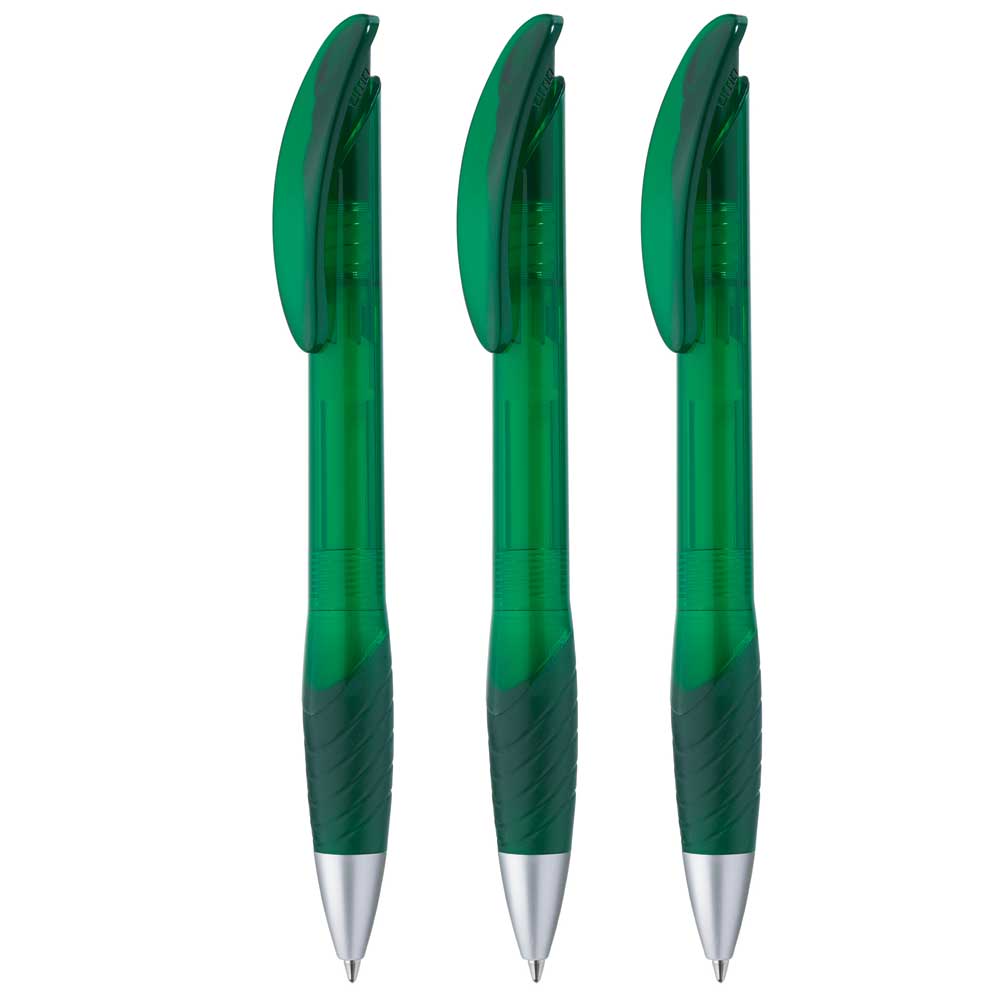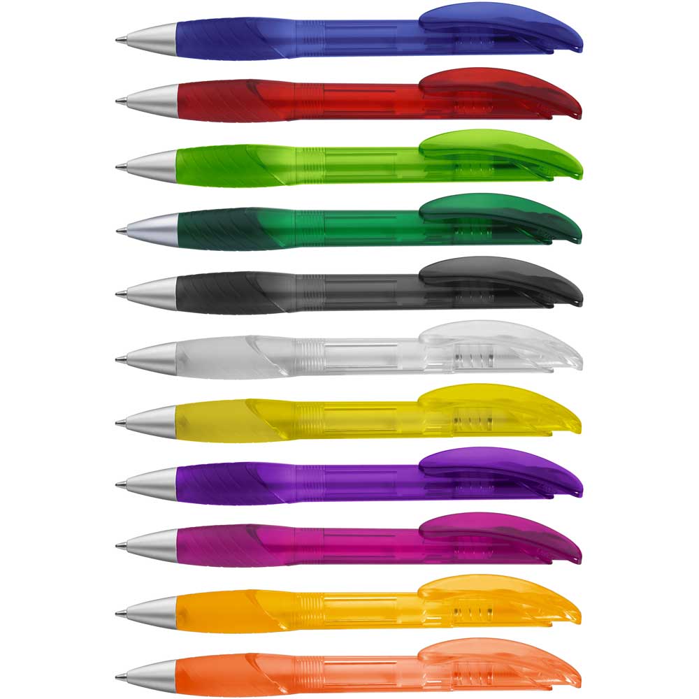 Druckkugelschreiber mit uni transparent glänzendem Gehäuse, ergonomischer Gummigriffzone, Bogenclipdrücker und Metallspitze mattchrom.