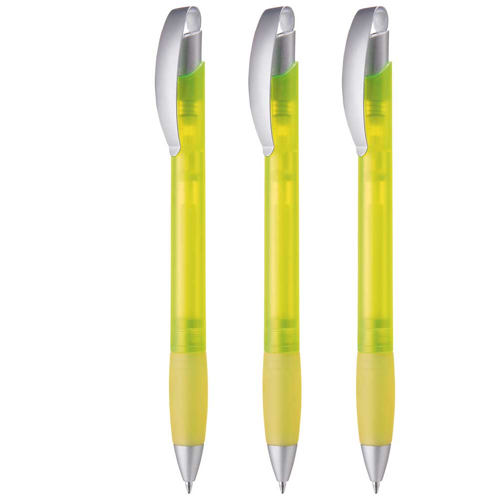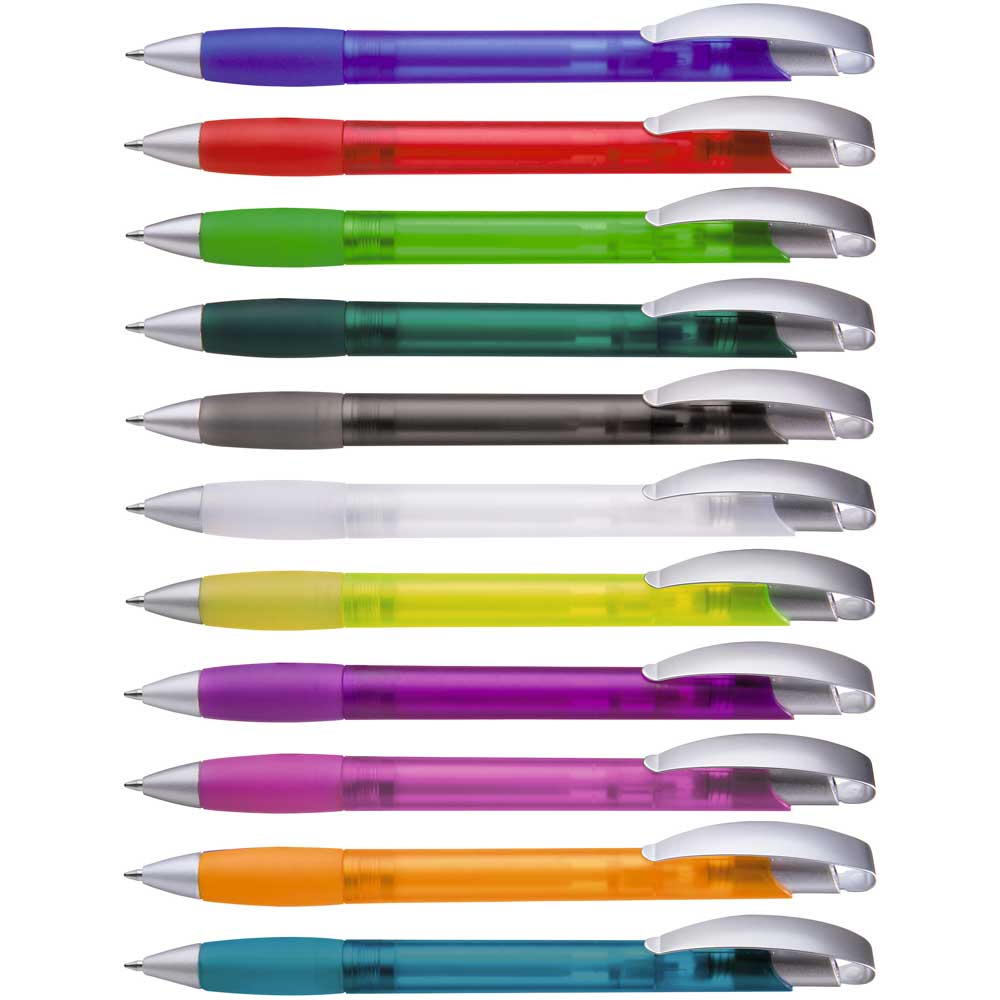 Druckkugelschreiber mit transparent gefrostetem Gehäuse, geschwungenem, matt verchromtem Metallbogenclipdrücker und gepolsterter Softgriffzone. Schaft und Griffzone unifarben transparent gefrostet. Spitze matt silber.