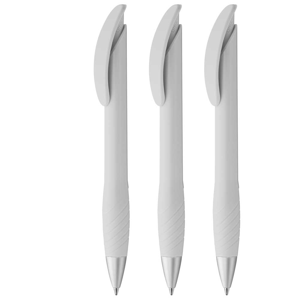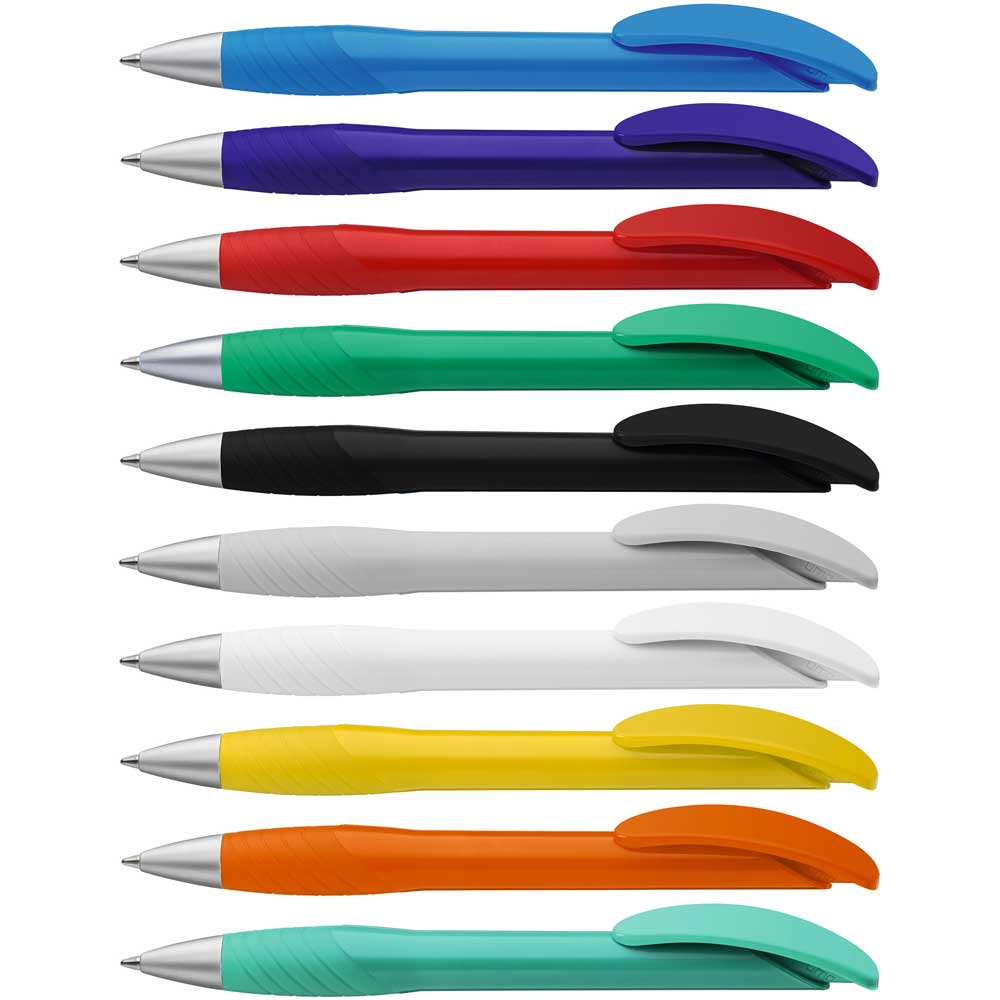 Druckkugelschreiber mit uni gedeckt glänzendem Gehäuse, ergonomischer Gummigriffzone, Bogenclipdrücker mit Metallspitze mattchrom.