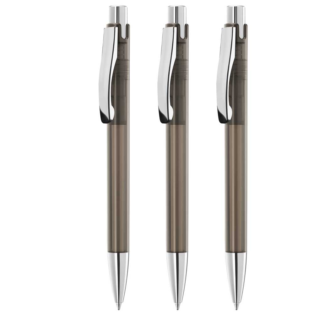 Druckkugelschreiber mit transparent glänzendem Gehäuse, schwerer Metallspitze, Metalldrücker und Metallclip glanzverchromt.