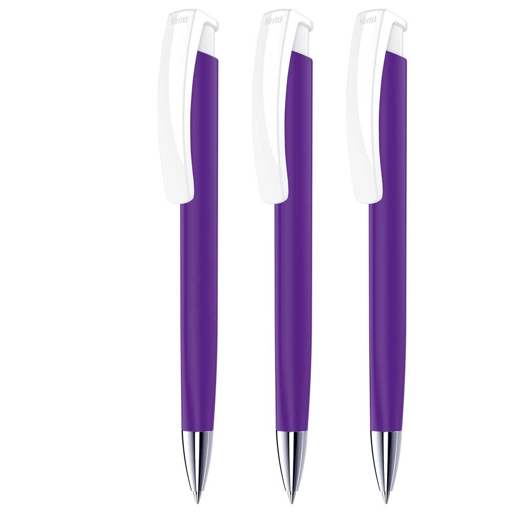 Druckkugelschreiber mit gummiertem Dreikantgehäuse und weiß gedeckt glänzendem Clip und schwerer Metallspitze glanzverchromt.