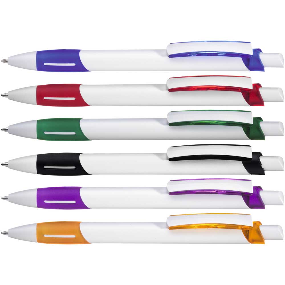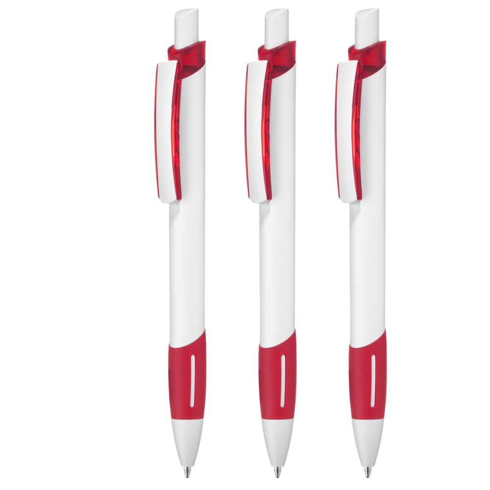 Druckkugelschreiber in weiß mit uni transparent gefrosteter Softgriffzone, Zierring und Clipschale unifarben.