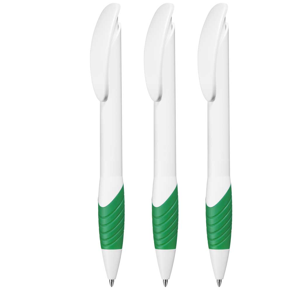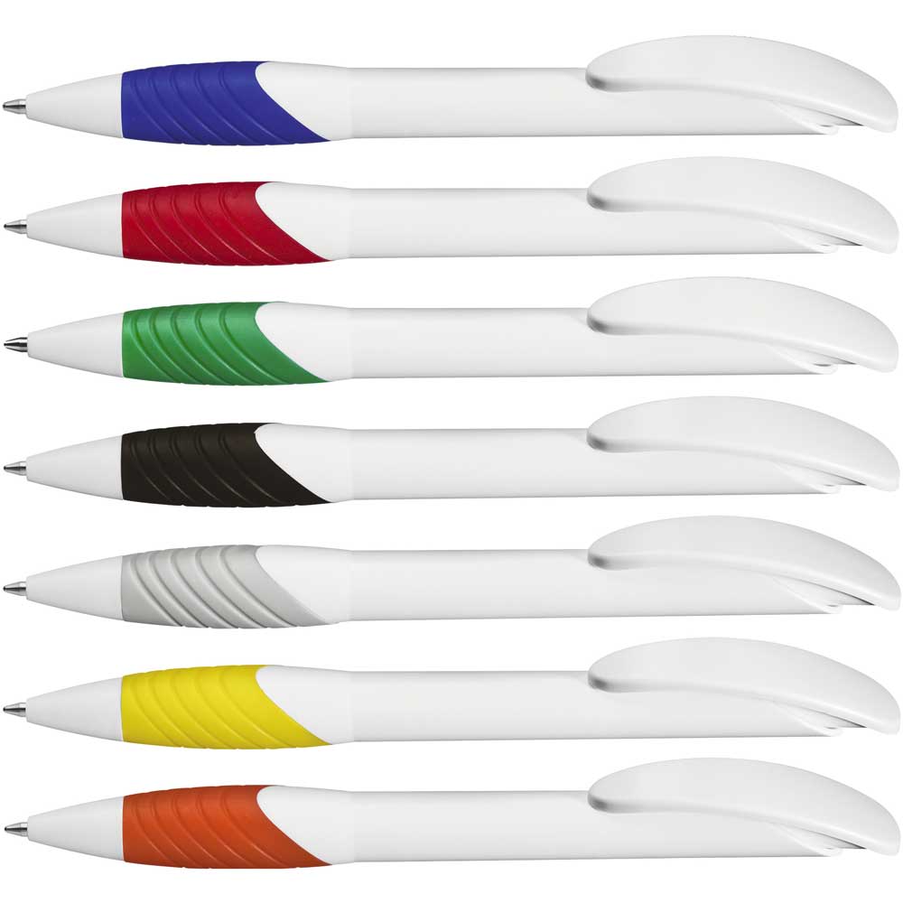Druckkugelschreiber mit weißem matten Gehäuse und Bogenclipdrücker. Ergonomische Gummigriffzone in gedeckten Farben.