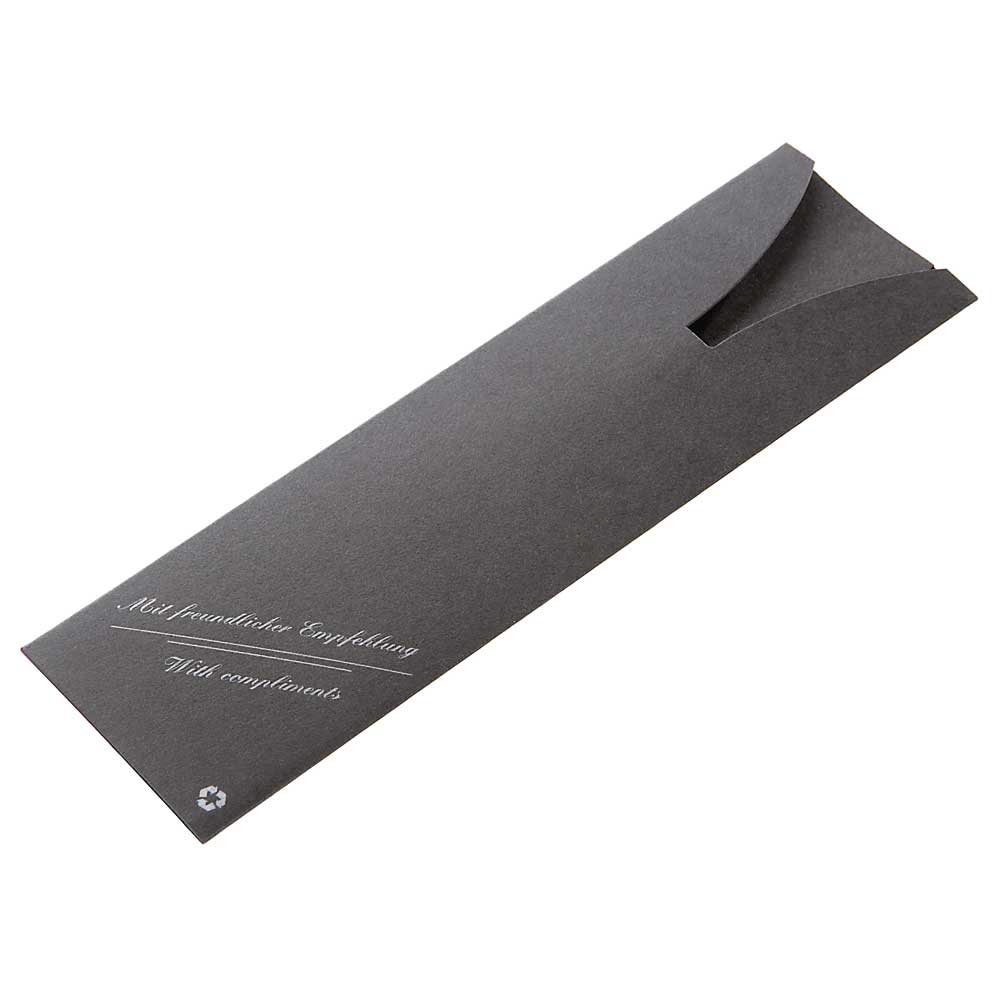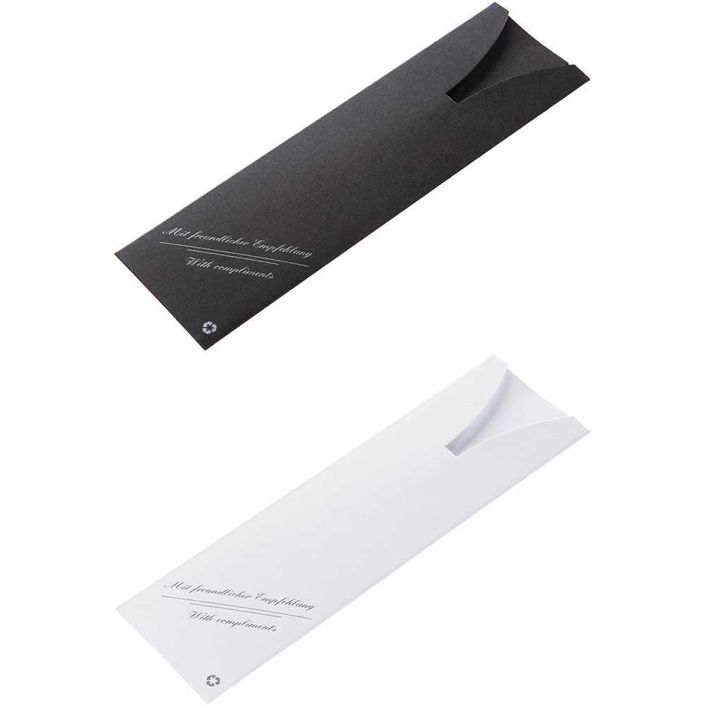Pappstecketui in schwarz oder weiß für ein Schreibgerät. Auch erhältlich mit dem Standardaufdruck: „Mit freundlicher Empfehlung - With compliments“.