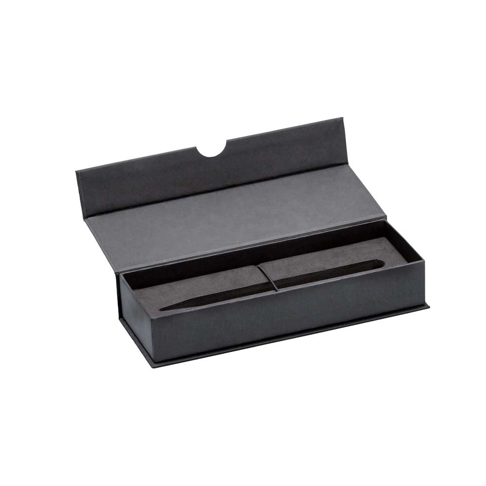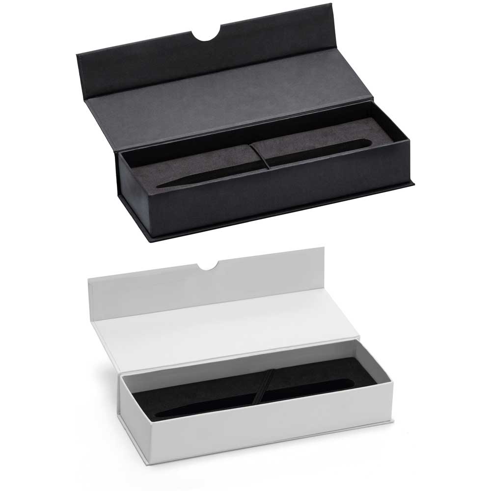 Klappetui in uni weiß oder schwarz mit Magnetverschluss für ein oder zwei Schreibgeräte. Kartonschuber in weiß. Auf Anfrage ist der Kartonschuber mit 4c-Gestaltung erhältlich.
