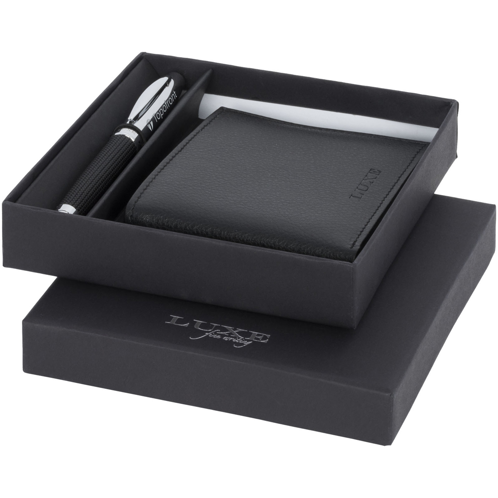 Zwei unerlässliche Gegenstände in einem eleganten Geschenkset. Der Kugelschreiber mit Lederumwicklung wird mit passendem Etui geliefert. Exklusiv entworfen und verpackt in einem „LUXE“-Geschenkkarton.