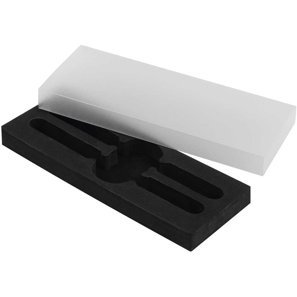Etui mit EVA-Einlage für 2 Schreibgeräte mit transparent gefrostetem Kunststoffschuber.