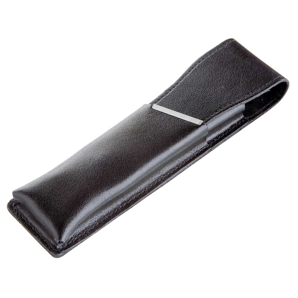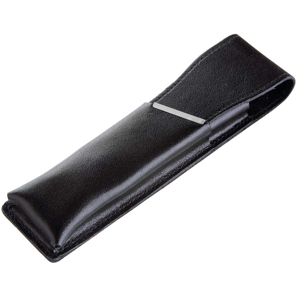 Schwarzes Lederetui für ein oder zwei Schreibgeräte mit silberfarbener Metallleiste.