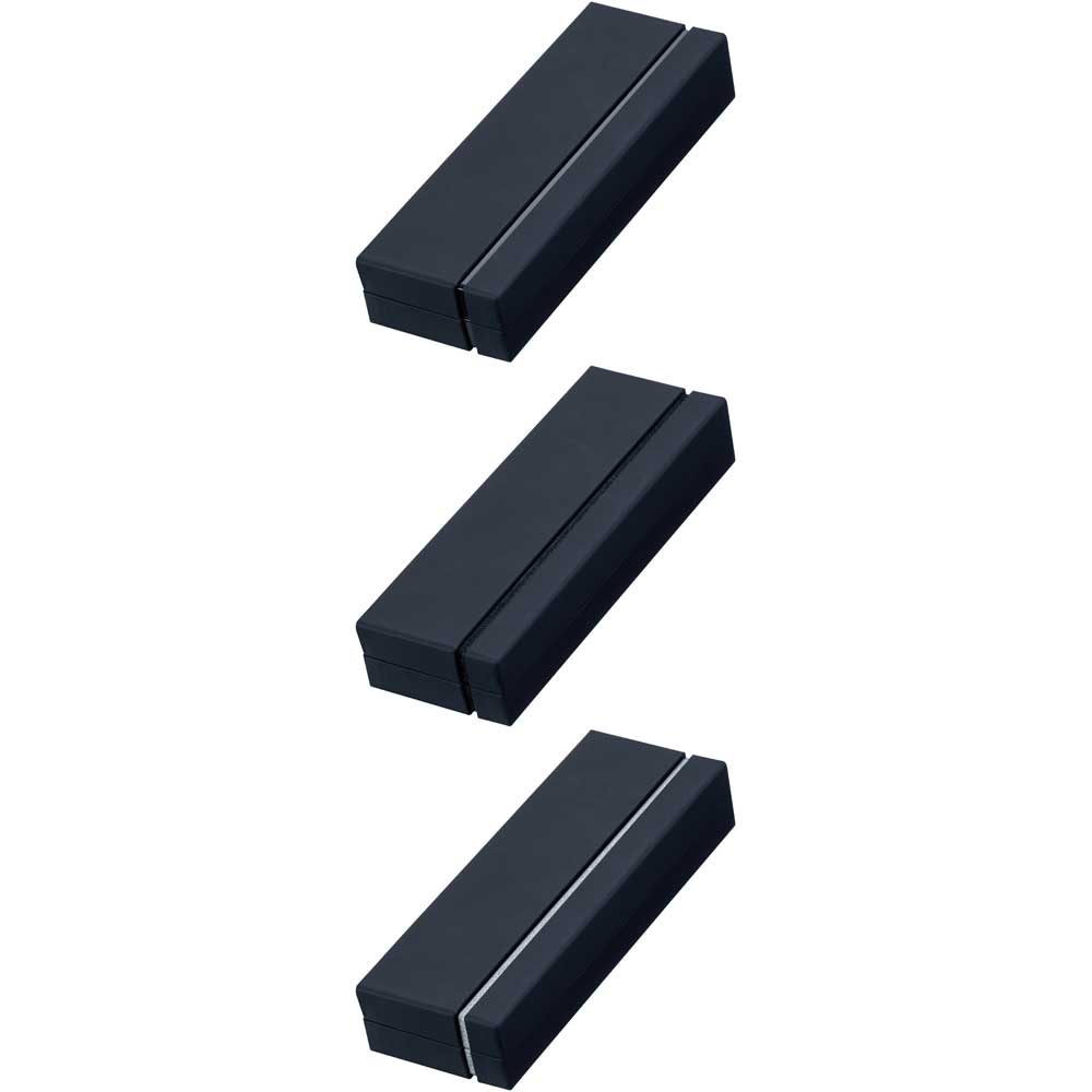 Zweiteiliges, schweres Pappetui in schwarz mit abnehmbarem Deckel mit eingelassener Ziernaht in schwarz glänzend oder schwarz, bzw. silber glitzernd, Kisseneinlage für ein oder zwei Schreibgeräte.
