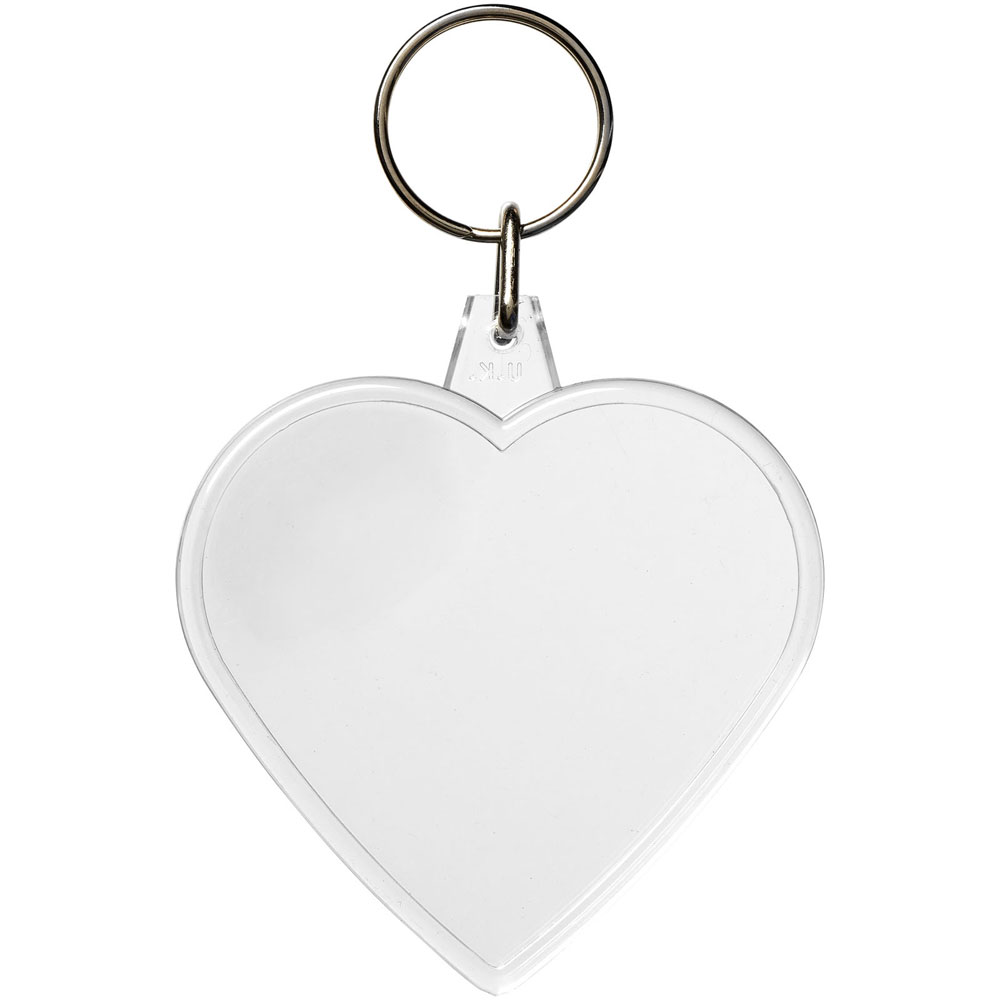 Transparenter, herzförmiger Schlüsselanhänger mit metallenem Schlüsselring. Der Metallring bietet ein flaches Profil, das sich ideal für Mailings eignet. Abmessungen der Druckeinlage: 5,8 cm x 5,0 cm.