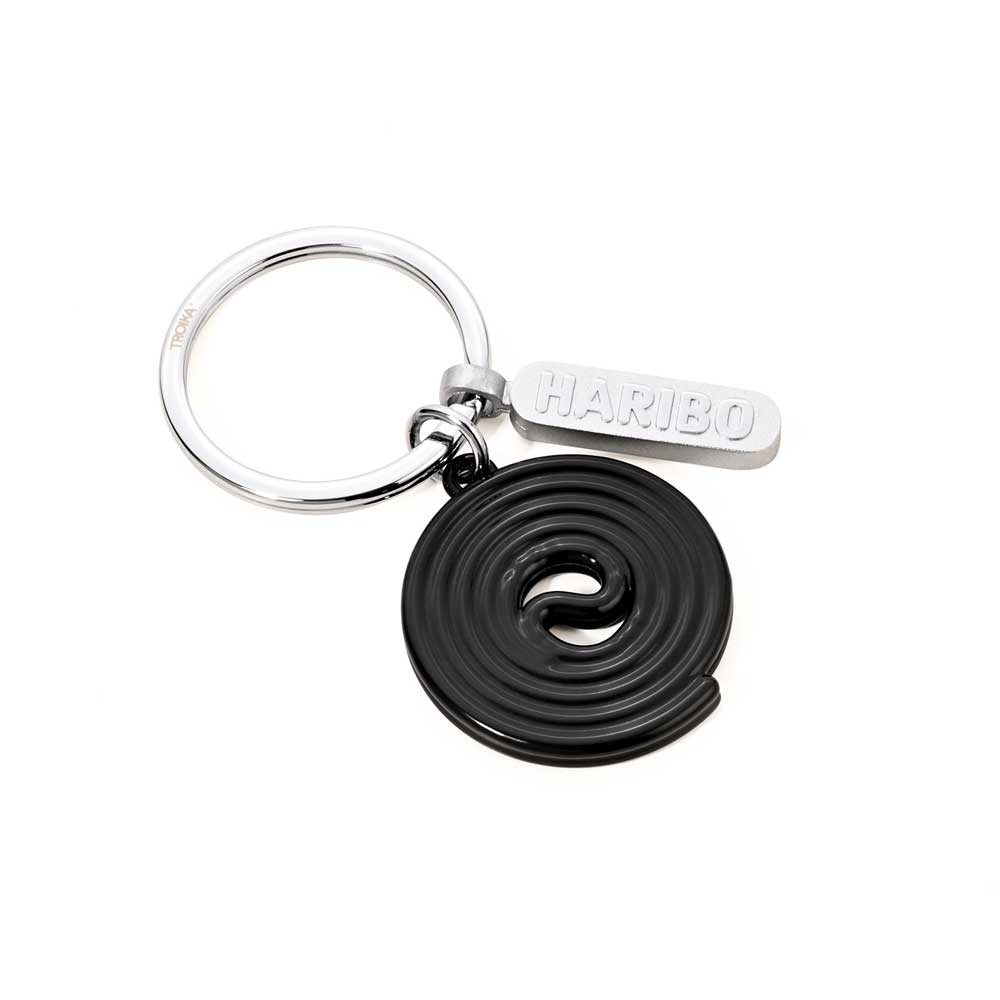 Schlüsselanhänger HARIBO Lakritzschnecke, mit kleinem Haribo Logo-Anhänger, Metallguss, glänzend, schwarz/silberfarben