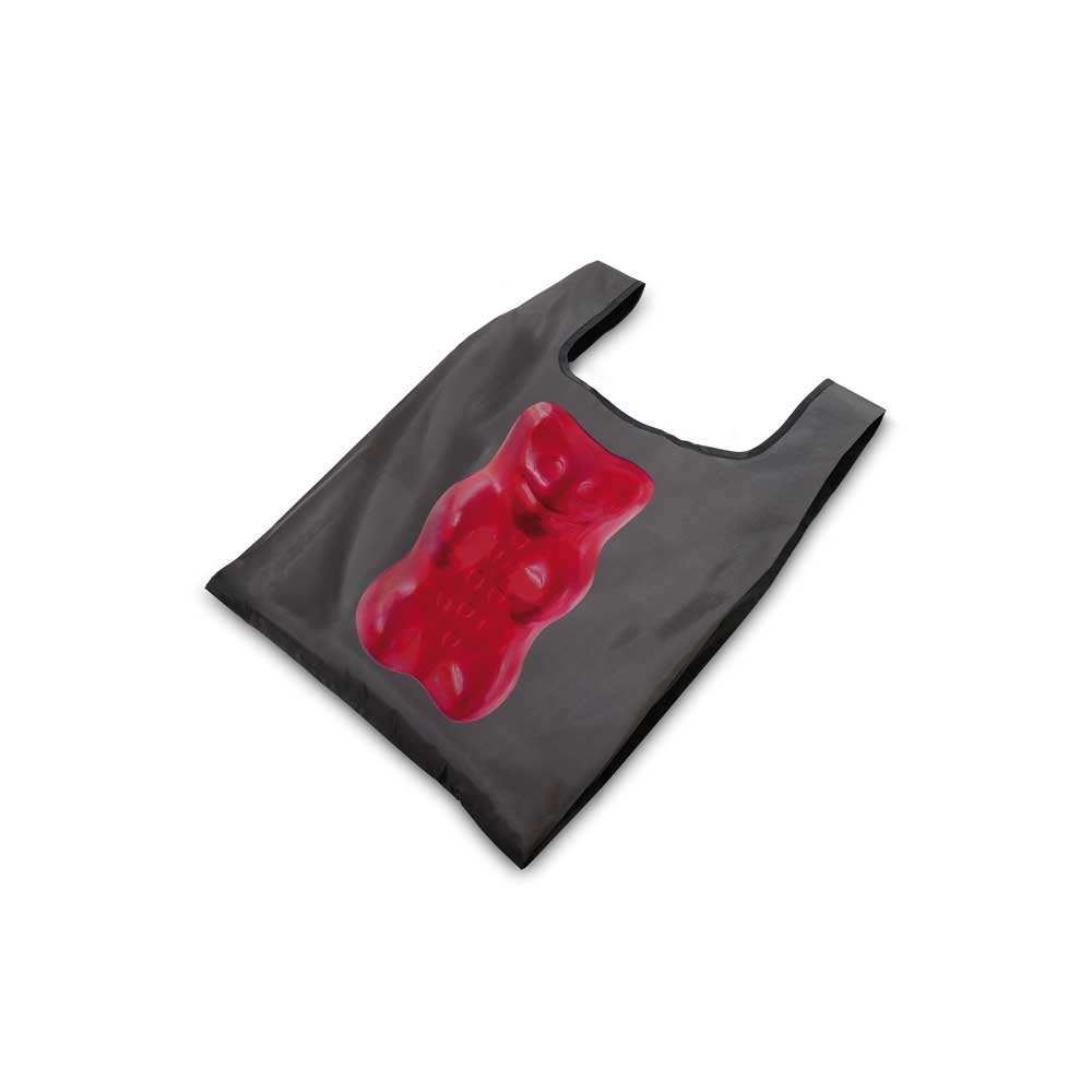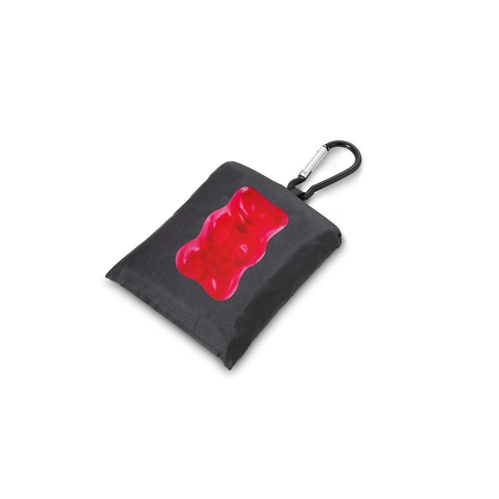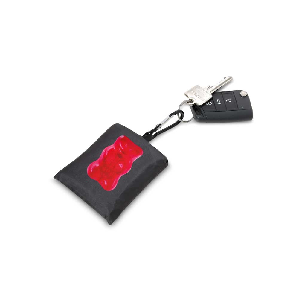 Schlüsselanhänger Einkaufstasche/Shopper inkl. Karabiner, Aufdruck: HARIBO & Goldbär, faltbar (platzsparend im kleinen Innenbeutel verstaubar), nachhaltig, da wiederverwertetes Material, recycelt aus ca. 4 Stück 1 Liter PET Flaschen, Kapazität ca. 10 Liter, Tragkraft bis zu 10 kg, 100% rPET Polyester, Aluminium, rPET, rot/schwarz