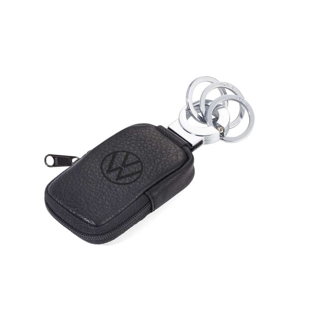 Schlüsselanhänger mit Täschchen für Kleingeld, APPLE AirTag®, geprägtes VW-Logo, Reißverschluss, 3 Schlüsselringe, praktischer "Klick-Verschluss", Leder, Metall, glänzend, schwarz/silberfarben
