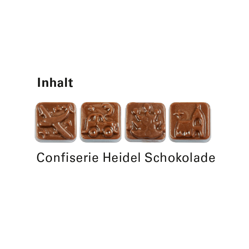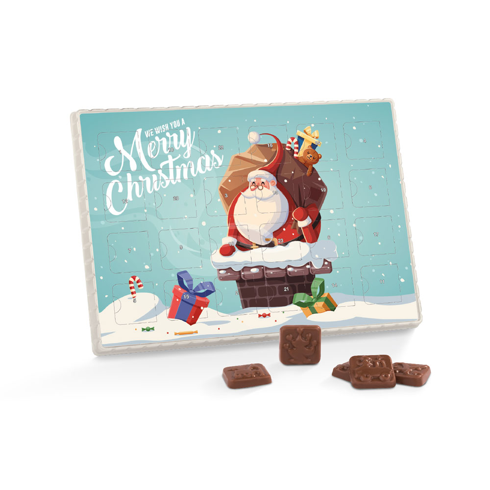 Tisch Adventskalender mit FSC-zertifiziertem Deckblatt, klimaneutral, individuell bedruckt Tiefziehteil in Créme-Weiß mit praktischem Stehfuß zum Ausklappen auf der Rückseite 24 Heidel Alpenvollmilch Schokoladentäfelchen, 50 g Saisonartikel - solange der Vorrat reicht!