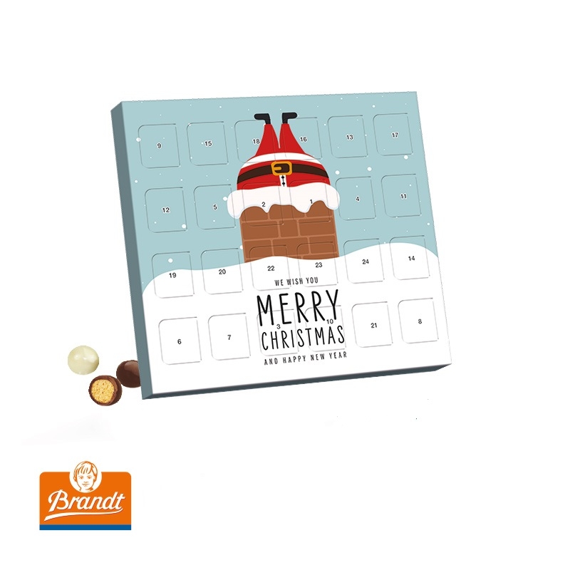 Tisch Adventskalender in FSC-zertifizierter Vollkartonhülle mit kompostierbarem Inlay, klimaneutral, individuell bedruckt. Ein praktischer, ausklappbarer Tischaufsteller ist im Rücken integriert.