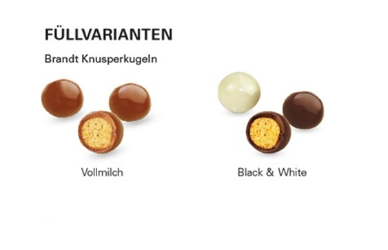 Inhalt: 24 Brandt Knusperkugeln mit knusprigem Kern aus Vollkorn, umhüllt von feinster Vollmilchschokolade oder Black & White, 21 g