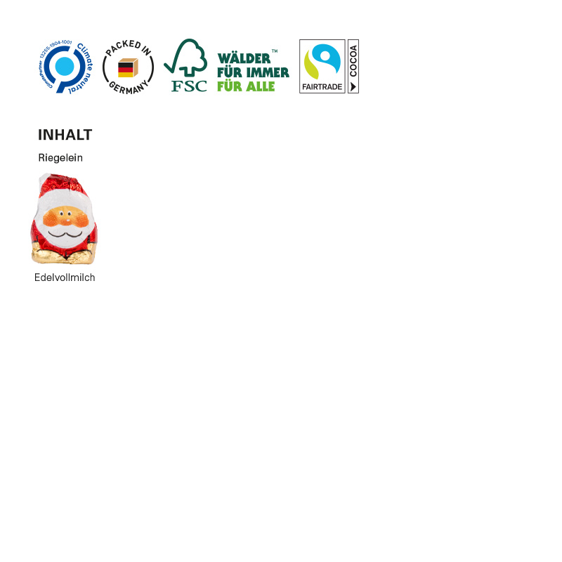 Riegelein Schoko Weihnachtsmann in aufklappbarer FSC-zertifizierter Werbekarte mit praktischer Abreißperforation, klimaneutral, individuell bedruckt Confiserie Riegelein Schokoladen Weihnachtsmann aus Edelvollmilchschokolade aus Fairtrade zertifiziertem Kakao, 5 g Fairtrade Kakao mit Mengenausgleich Fairtrade-deutschland.de/siegel Saisonartikel - solange der Vorrat reicht!