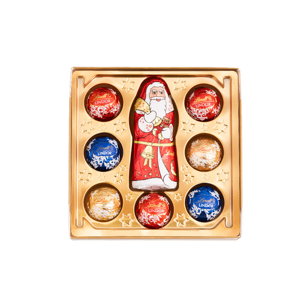Inhalt: Lindt Mini Pralinés: Coeur a l'orange, Macchiato Stern, Caramel Amande, Vollmilch mit Krokant, Marc de Champagne Trüffel