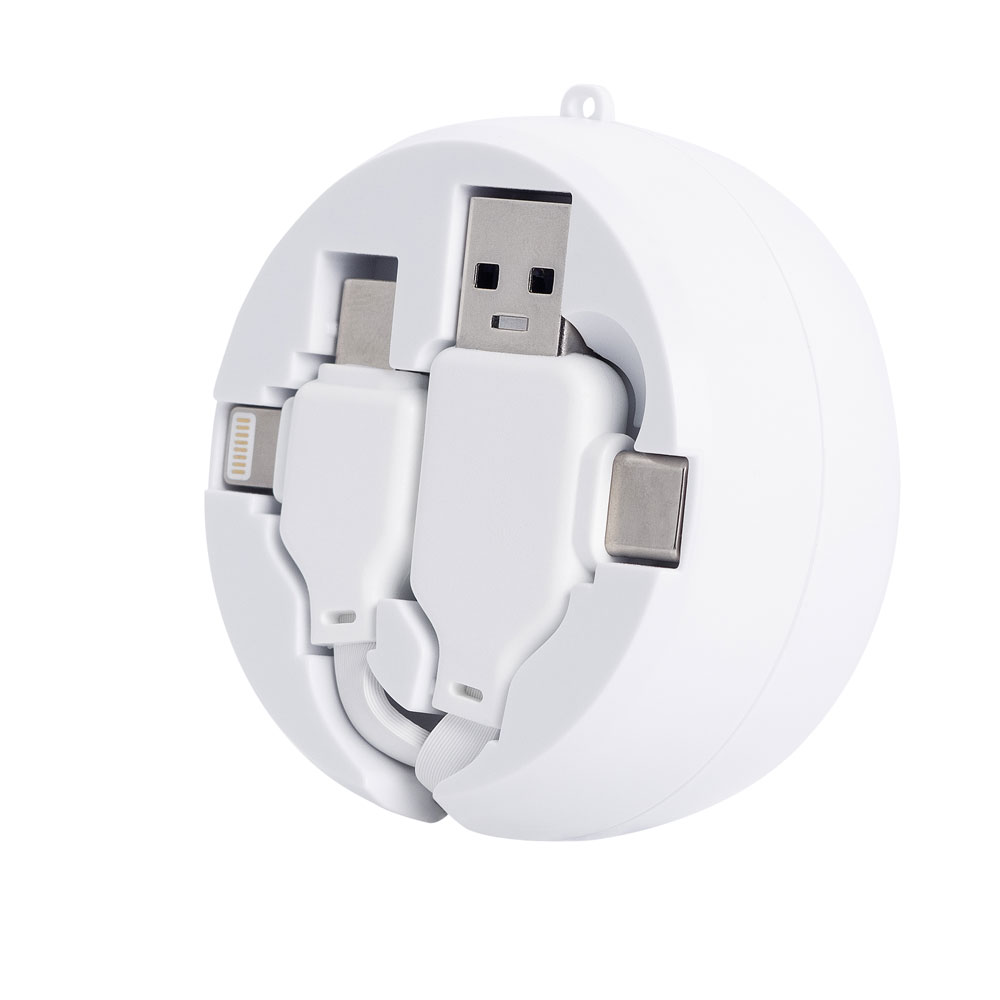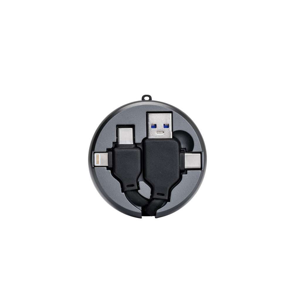 Kabeltrommel mit allen wichtigen Anschlüssen (USB-A, Typ-C und Lightning),